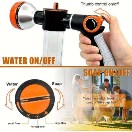 Πιστόλι ποτίσματος για λάστιχο, με 8 διαφορετικές ρυθμίσεις ψεκασμού. Διαθέτει εύχρηση βαλβίδα ώθησης αντίχειρα. Κατασκευασμένο από ενισχυμένο πλαστικό, ανθεκτικό στις