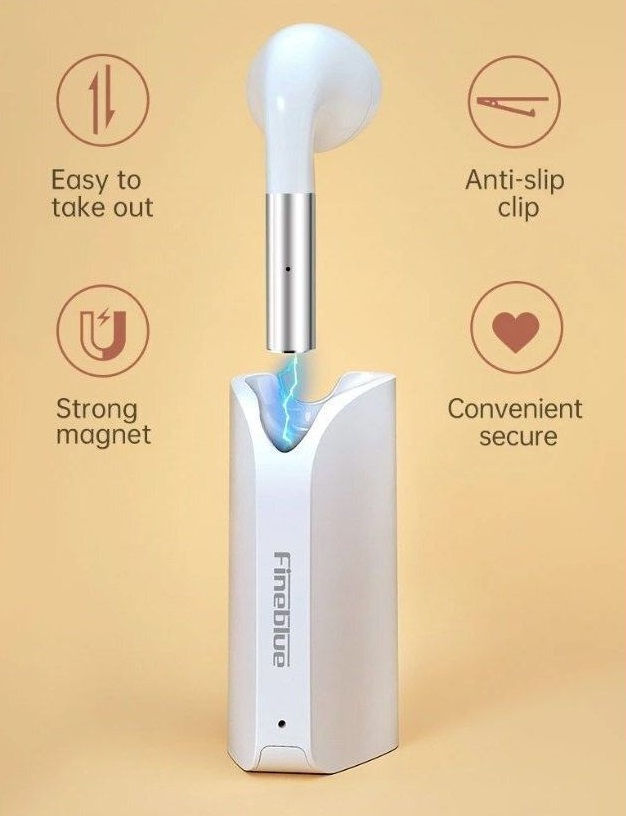 Ακουστικό Handsfree Bluetooth με θήκη φόρτισης, με σχεδιασμό clip-on-collar στη θήκη για εύκολη μεταφορά. Ασύρματο, διακριτικό και πρακτικό, με εξαιρετικό ήχο και ιδιαίτερα ανθεκτική κατασκευή.