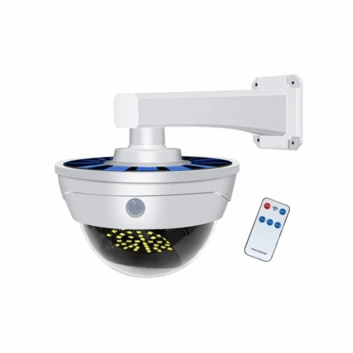 Ηλιακός προβολέας LED COB με πάνελ φόρτισης και αισθητήρα κίνησης, σε σχεδιασμό κάμερας ασφαλείας.