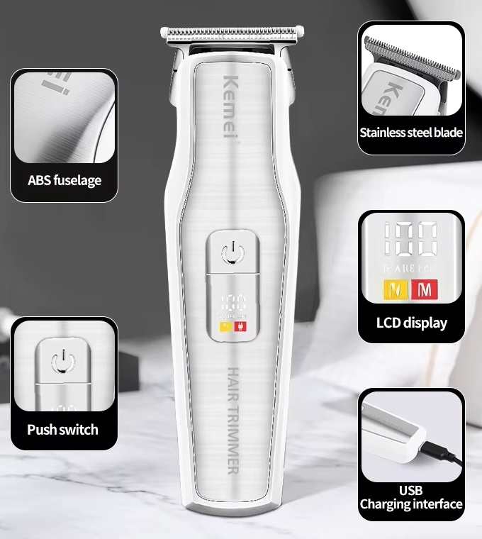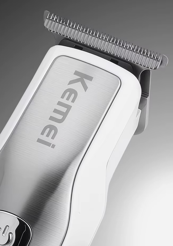 Επαγγελματική, επαναφορτιζόμενη ξυριστική-κουρευτική μηχανή και trimmer Kemei, με εξαιρετικό μεταλλικό design. Χαρακτηριστικά: Προσαρμόσιμη λεπίδα ακριβείας από ανοξείδωτο ατσάλι που πλένεται