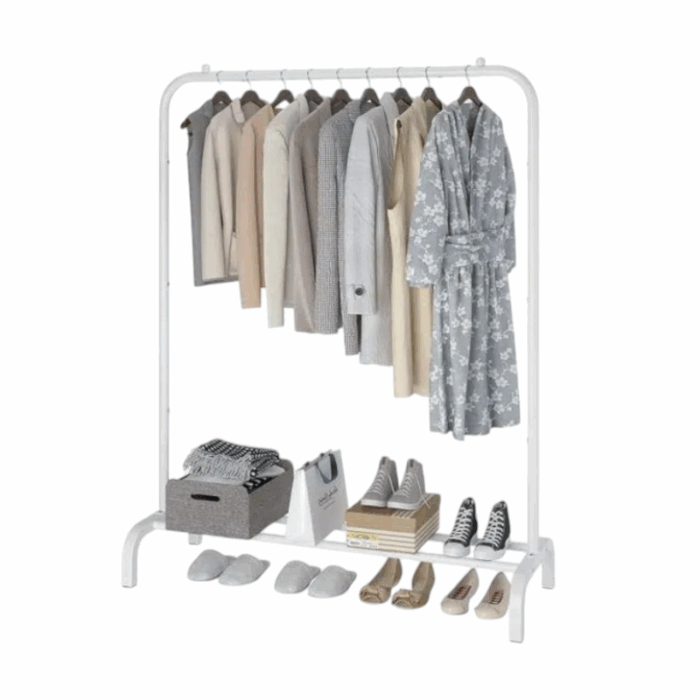 Κρεμάστρα δαπέδου μονή, μεταλλική, με ράφι παπουτσιών, ιδανική ως έπιπλο εισόδου ή για την οργάνωση των ρούχων στο δωμάτιό σας.