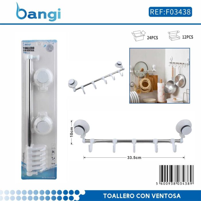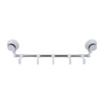 Κρεμάστρα πετσέτας μπάνιου με άγκιστρα κρεμάσματος ρυθμιζόμενης θέσης, με μεταλλική ράγα inox και πλαστικές βάσεις υψηλής ανθεκτικότητας. Εύκολη τοποθέτηση με ισχυρές βεντούζες, χωρίς να απαιτείται βίδωμα.
