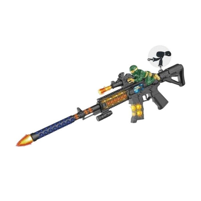 Ρουκέτα στρατιώτη με ηχητικά εφέ εκτόξευσης. Οι διαστάσεις της συσκευασίας είναι: Υ. 65cm, Π. 19cm, Φ. 7.5cm.
