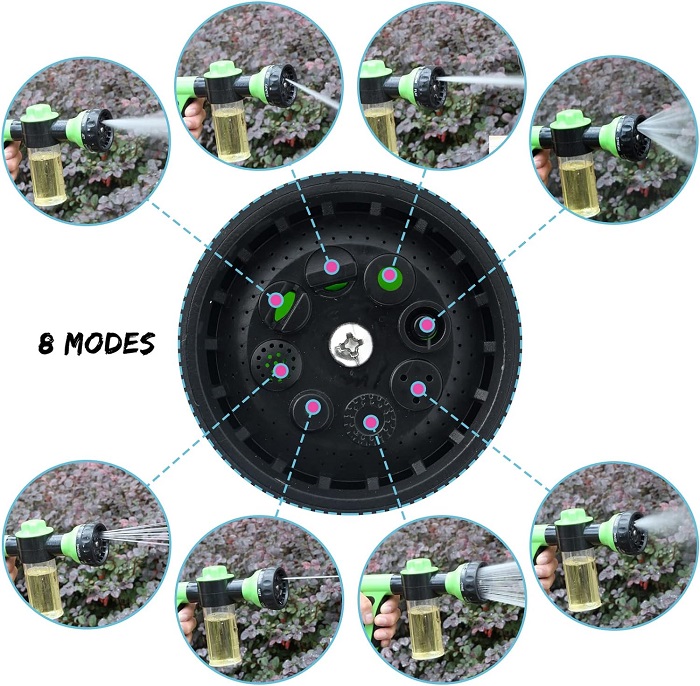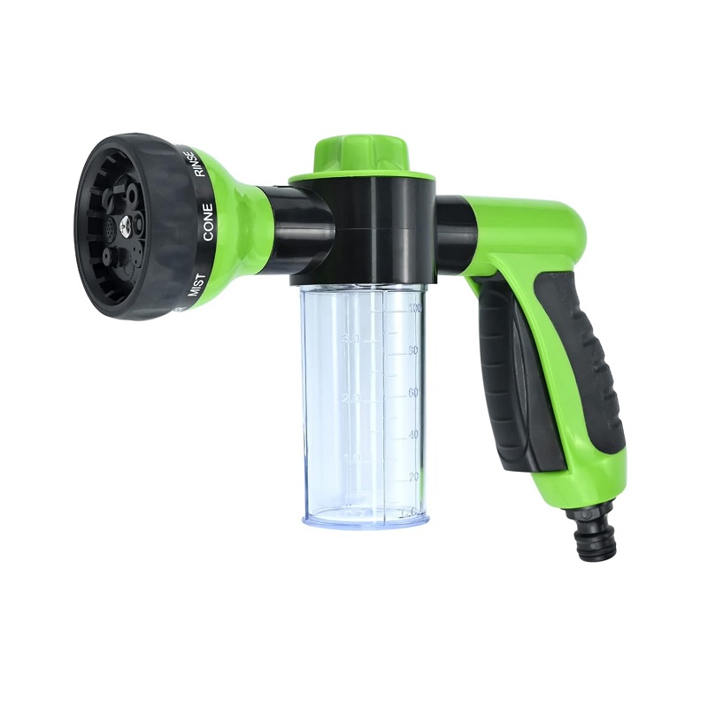 Πιστόλι ποτίσματος για λάστιχο με ενσωματωμένο δοχείο σαπουνιού 100ml. Διαθέτει εργονομική λαβή, 8 διαφορετικές ρυθμίσεις ψεκασμού και ρυθμιζόμενη πίεση. Διαστάσεις: 21x15cm.
