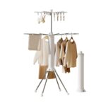 Πτυσσόμενη κρεμάστρα δαπέδου και απλώστρα ρούχων πολλαπλών χρήσεων, με μεταλλικό σκελετό, κλιπς/μανταλάκια μικρών ρούχων και ροδάκια μετακίνησης.