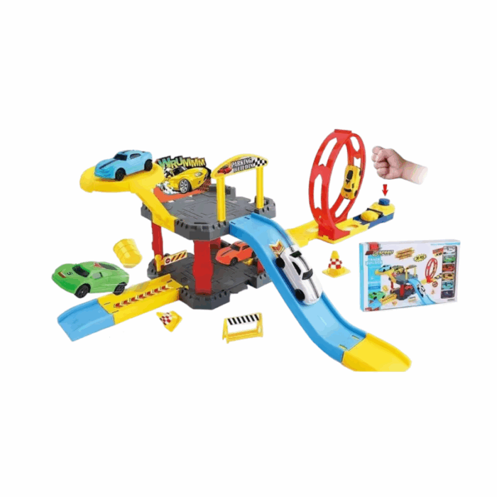 Αυτοκινητόδρομος πίστα-πάρκινγ με πολύχρωμο σχεδιασμό, με εκτοξευτή και αξεσουάρ. Στήσε πανεύκολα τη πίστα σου και ετοιμάσου για ατελείωτους αγώνες ταχύτητας και τρελά κόλπα! Περιλαμβάνει 6 αυτοκινητάκια.