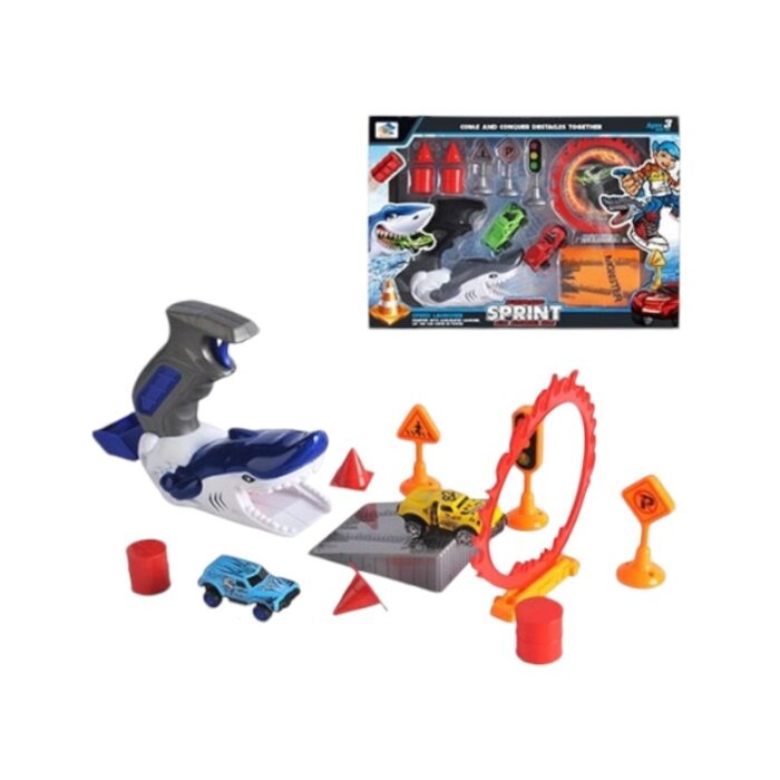 Πίστα αυτοκινήτων Καρχαρίας με εκτοξευτή και αξεσουάρ. Στήσε πανεύκολα τη πίστα σου και ετοιμάσου για ατελείωτους αγώνες ταχύτητας και τρελά κόλπα!