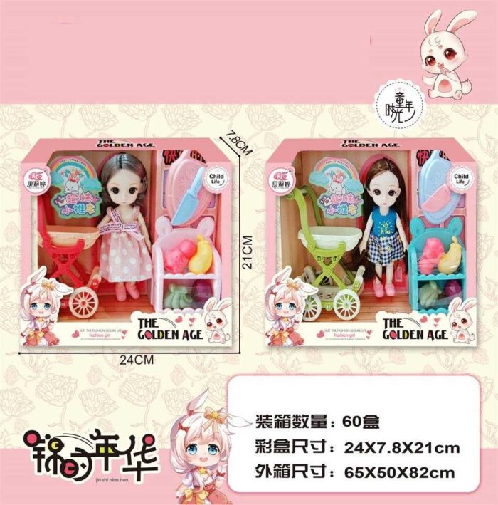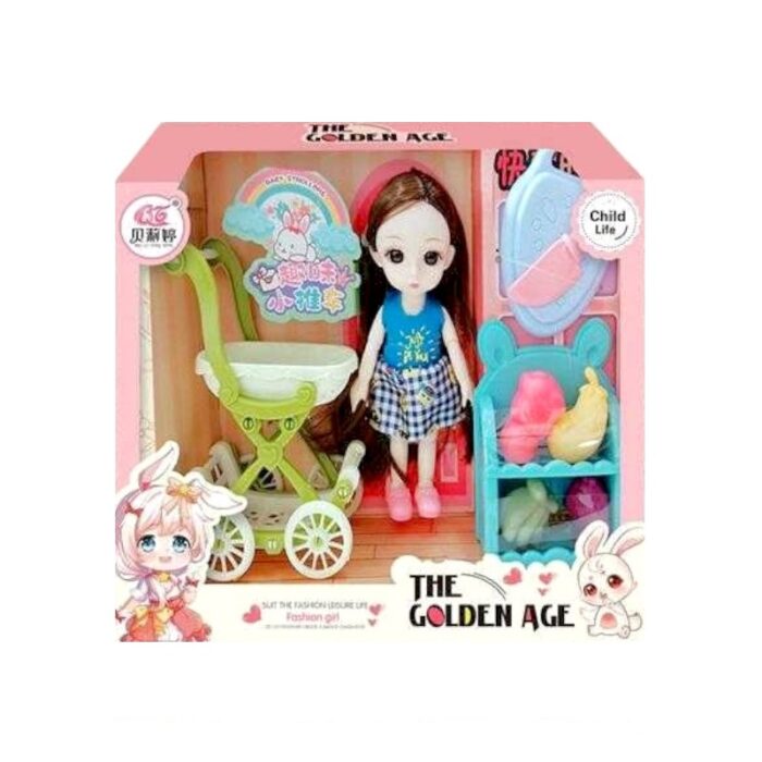 Σετ κούκλα σε vintage στυλ, με σετ αξεσουάρ κουζίνας και καροτσάκι μωρού, σε υπέροχο πολύχρωμο σχεδιασμό!