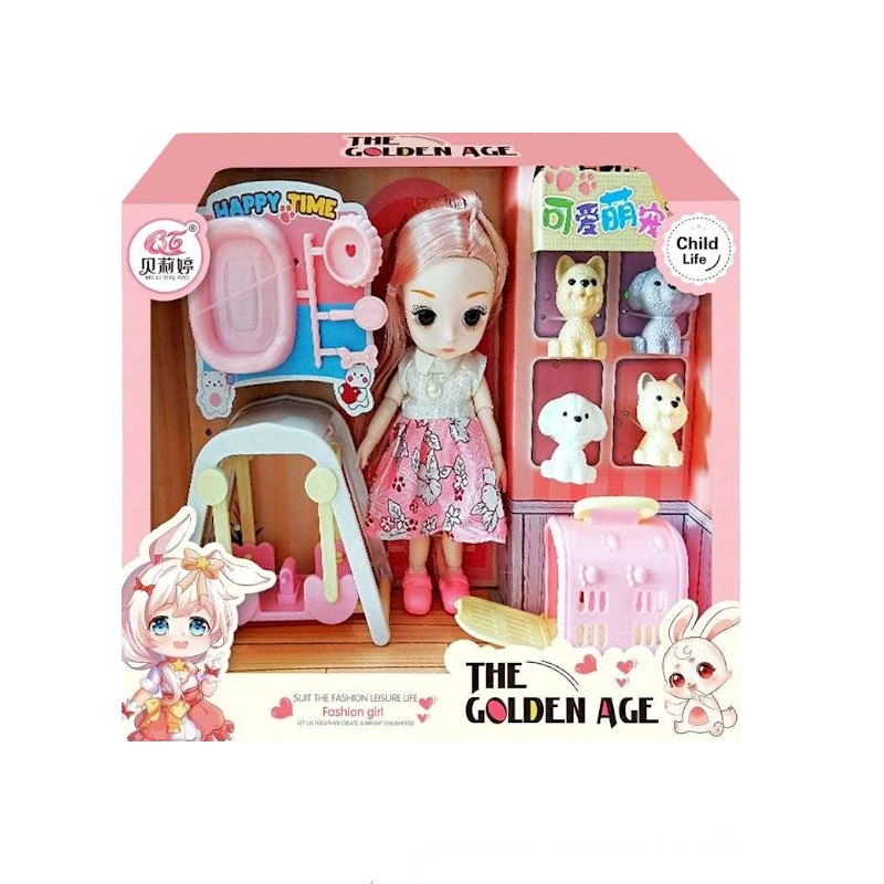 Σετ κούκλα σε vintage στυλ, με κατοικίδια ζωάκια και αξεσουάρ φροντίδας, σε υπέροχο πολύχρωμο σχεδιασμό!