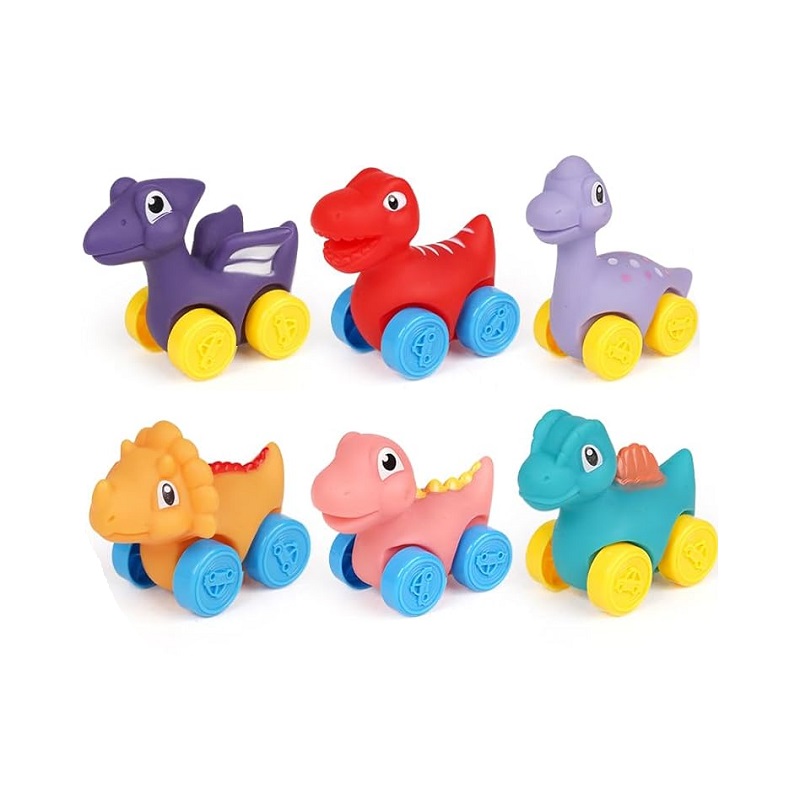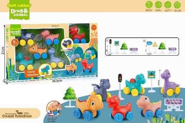 Σετ λαστιχένιες φιγούρες Δεινοσαύρων με ροδάκια, από μαλακό μη τοξικό υλικό, σε πολύχρωμο σχεδιασμό, ιδανικές για παιχνίδι βρεφικής και προσχολικής ηλικίας.