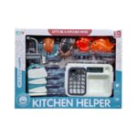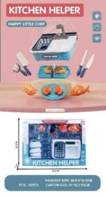 Παιχνίδι νεροχύτης κουζίνας με αξεσουάρ σκεύη και τρόφιμα, σε υπέροχο πολύχρωμο σχεδιασμό.