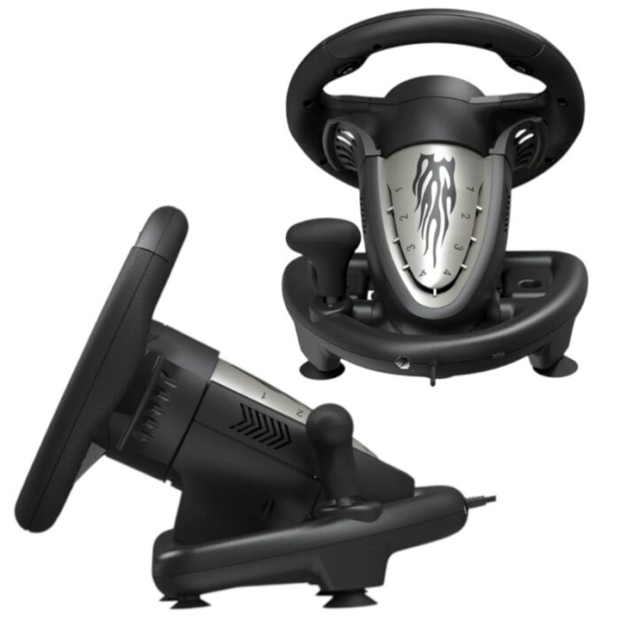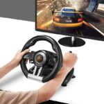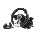 Σετ τιμονιέρα gaming PXN-V3PRO με μεγάλο τιμόνι και πετάλια ποδιών, με ελαστικό περίβλημα και ρεαλιστικό σχεδιασμό για να απολαμβάνεις το παιχνίδι σου οδηγώντας σαν επαγγελματίας, ιδανικό για τους λάτρεις των racing games.