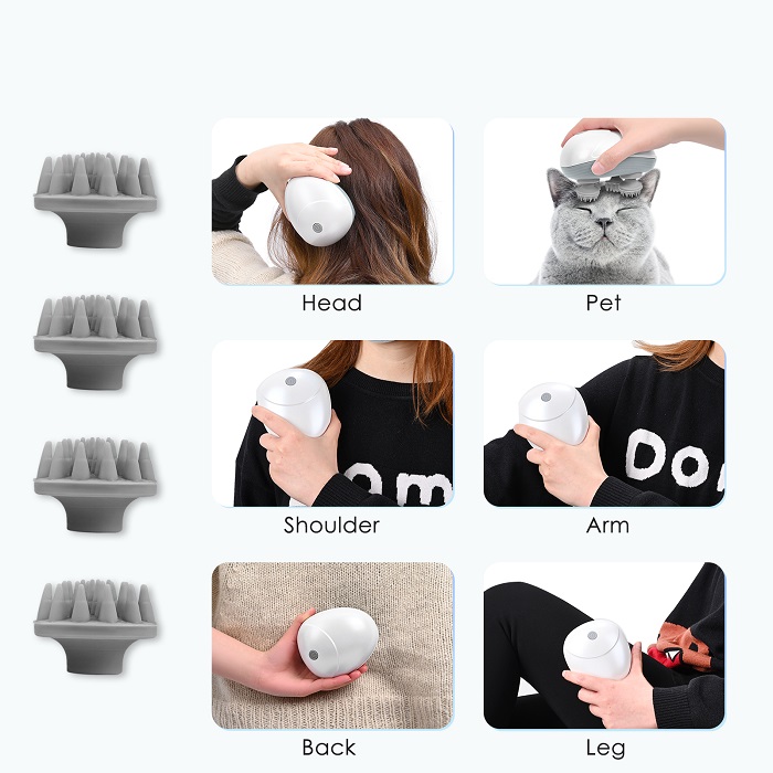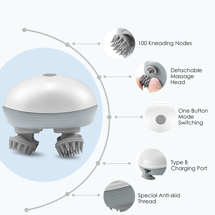 Συσκευή μασάζ κεφαλής με 4 μαλακά άκρα σιλικόνης που κινούνται κυκλικά και προσφέρουν μια απίστευτη αίσθηση χαλάρωσης με πολλές ευεργετικές ιδιότητες Ιδιότητες: Βελτιώνει την κυκλοφορία του αίματος, ανακουφίζει από πονοκεφάλους, πιάσιμο και ενοχλήσεις ενώ βοηθά στην γρήγορη και υγιή ανάπτυξη των μαλλιών σας. Είναι επαναφορτιζόμενη για άνετη ασύρματη χρήση. Μπορεί να χρησιμοποιηθεί σε βρεγμένο δέρμα καθώς οι κεφαλές τις είναι αδιάβροχες ενώ αφαιρούνται και πλένονται. Μπορεί ακόμη να χρησιμοποιηθεί και στο υπόλοιπο σώμα για ήπιο μασαζ ή και στο κατοικίδιό σας.
