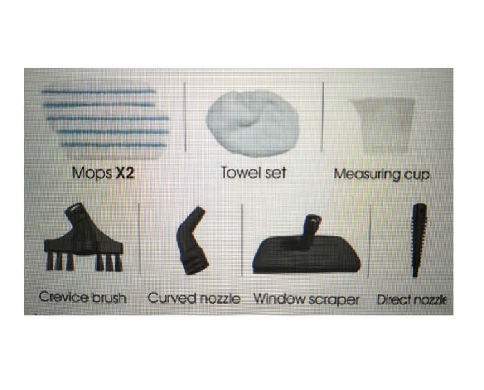 Διαθέτει 2 ανταλλάκτικά πανιά καθαρισμού-steam pads που πλένονται εύκολα στο πλυντήριο, 4 κεφαλές καθαρισμού και δοσομετρητή νερού.