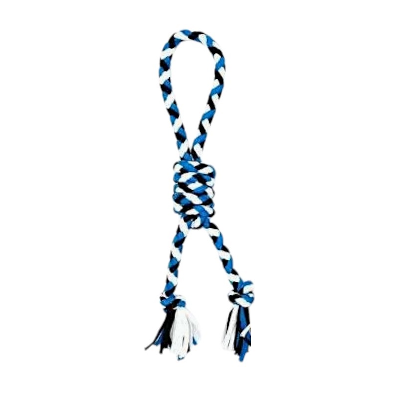 Παιχνίδι σκύλου σχοινί με κόμπους, από ανθεκτικό, μη τοξικό πολυεστέρα, ιδανικό για παιχνίδια τραβήγματος/αντίστασης ενώ παράλληλα βοηθά στην υγιεινή στόματος του σκύλου σας καθώς καθαρίζει ήπια και απασχολεί τα δόντια του. Συνολικό μήκος: 35cm.